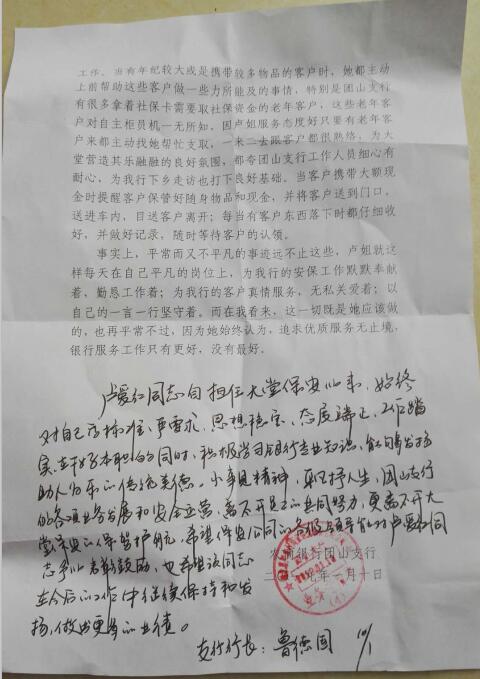 在客流量較多時地能主動鋪助大堂經(jīng)理完成客戶的分流和引導(dǎo)工作,當(dāng)有年紀(jì)較大或是攜帶較多物品的客戶時,她都主動上前幫助這些客戶做一些力所能及的事情,特別是團(tuán)山有很多拿著社??ㄐ枰∩绫YY金的老年客戶,這些老年客戶對自主柜員機(jī)一無所知,因盧姐服務(wù)態(tài)度好只要有老年客戶來都主動找她幫忙支取,一米二去跟吝戶都很熟絡(luò),為大堂營造其樂融融的良好氛圍,都夸團(tuán)山支行工作人員細(xì)心有耐心,為我行下鄉(xiāng)走訪也打下良好基礎(chǔ)。當(dāng)客戶攜帶大額現(xiàn)金時提醒客戶保管好隨身物品和現(xiàn)金、并將客戶送到門口送進(jìn)車內(nèi),日送客戶離開;每當(dāng)有客戶東西落下時都仔細(xì)收好,并做好記錄,隨時等待客戶的認(rèn)領(lǐng)